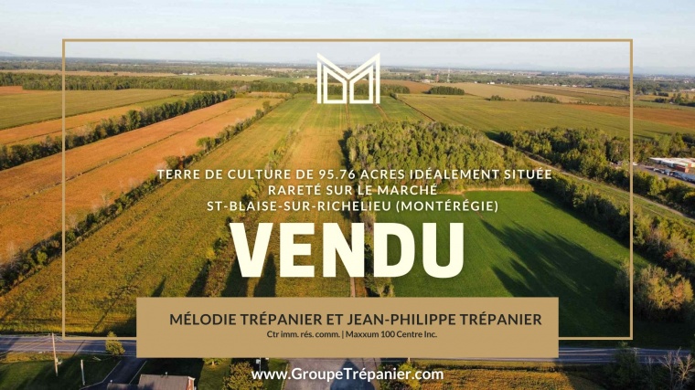 St-Blaise-sur-Richelieu (Montérégie) : Découvrez cette terre de culture de 95.76 acres (113.35 arpents) idéalement située au coin du chemin de Grand-Bernier et de la Montée de l’Érablière. Une rareté sur le marché. La terre, belle et droite, est en culture (non drainée). Celle-ci peut accueillir différents types de cultures. La ...